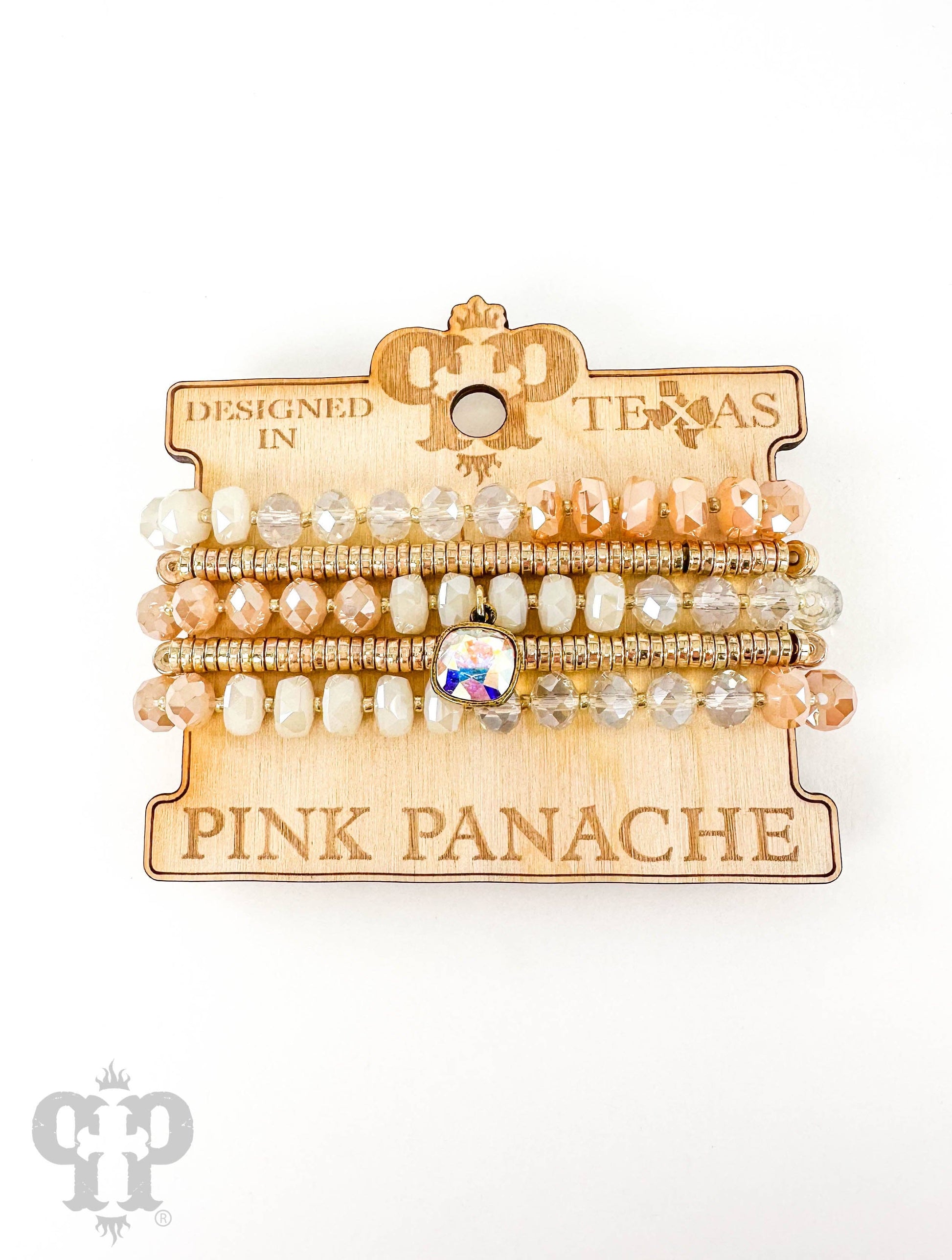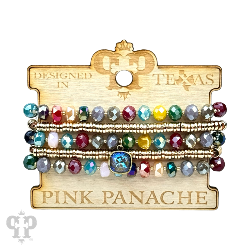 This five strand bracelet has round and disc shape crystal and gold disc strands with a 10mm Austrian crystal drop. The setting for the drop was custom made for Pink Panache in the USA. One size fits most.