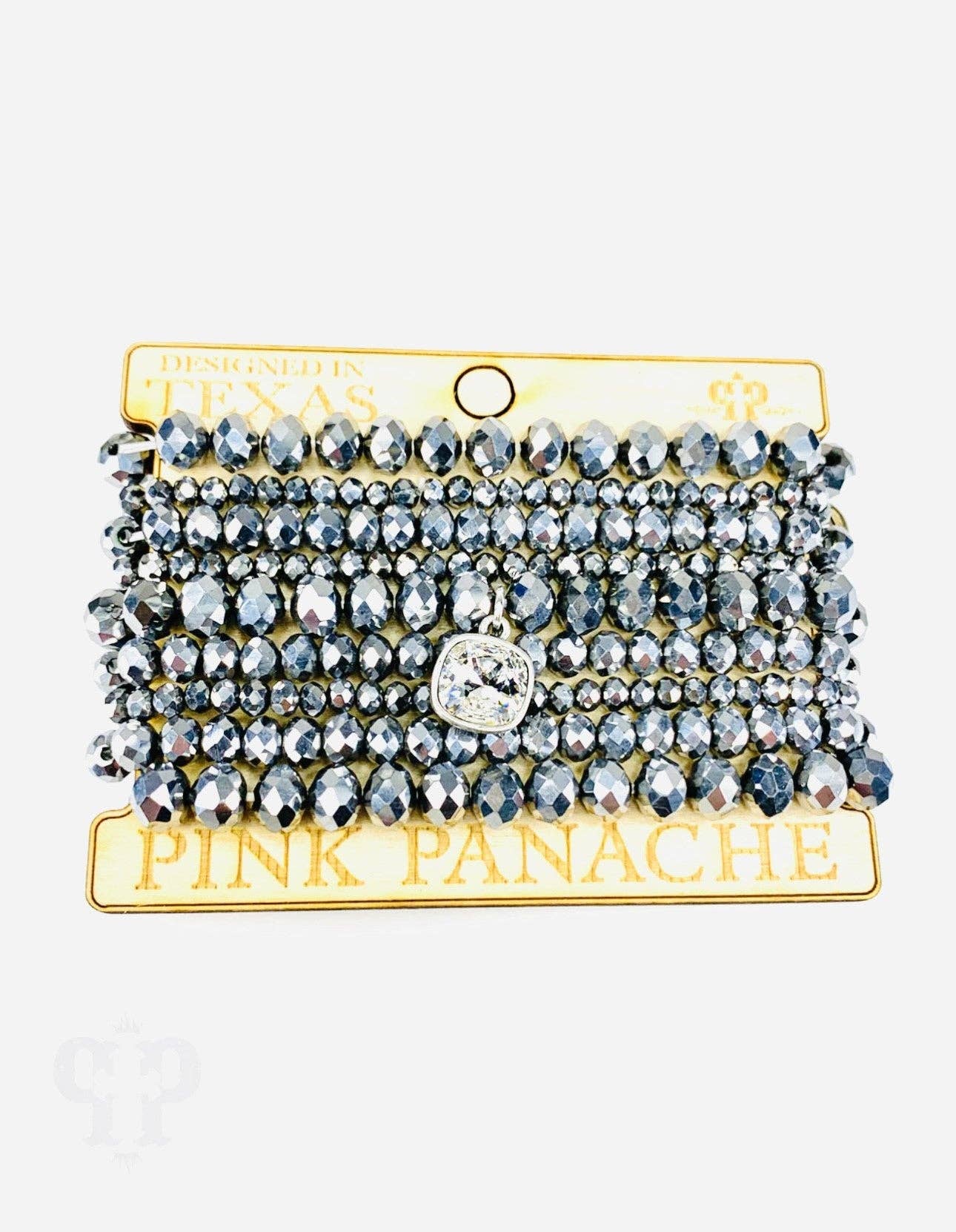 This bracelet set has nine strands of faceted beads. The charm is a 10mm Austrian crystal in a setting custom made for Pink Panache in the USA. Stretches for easy on and off. One size fits most.