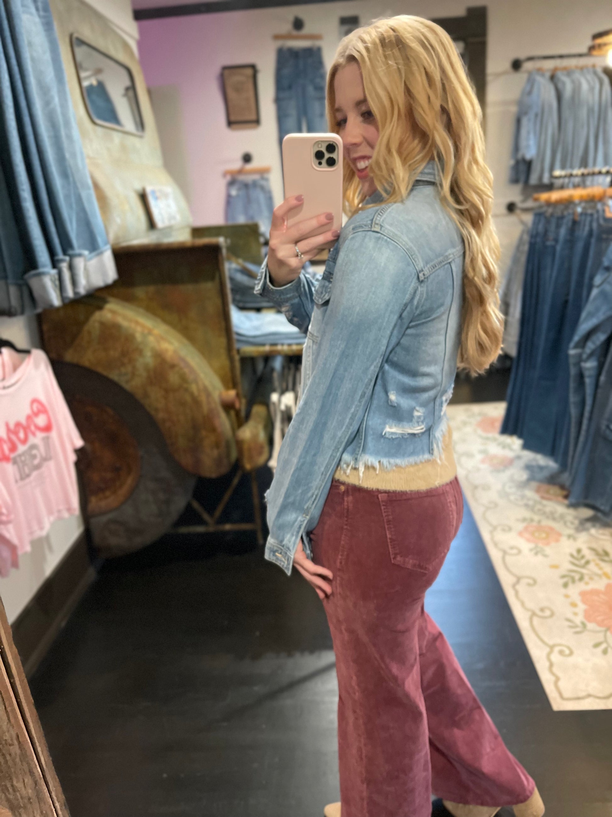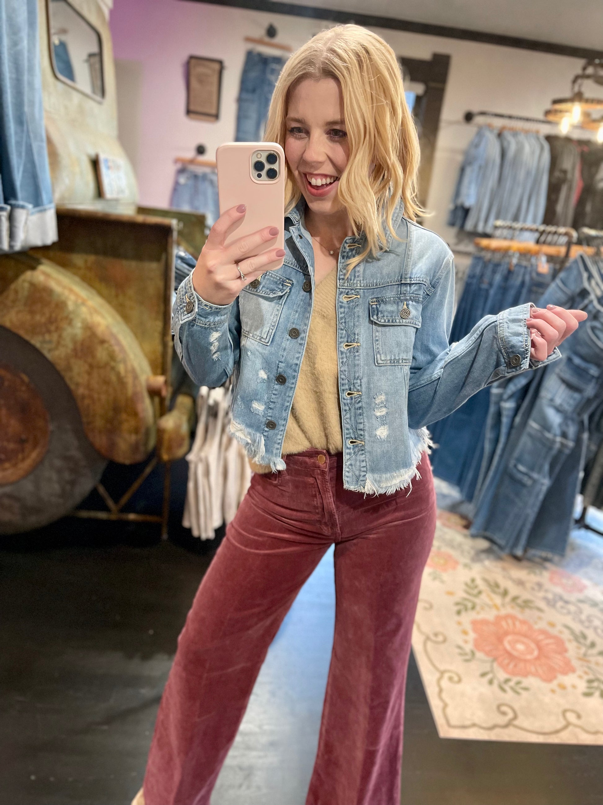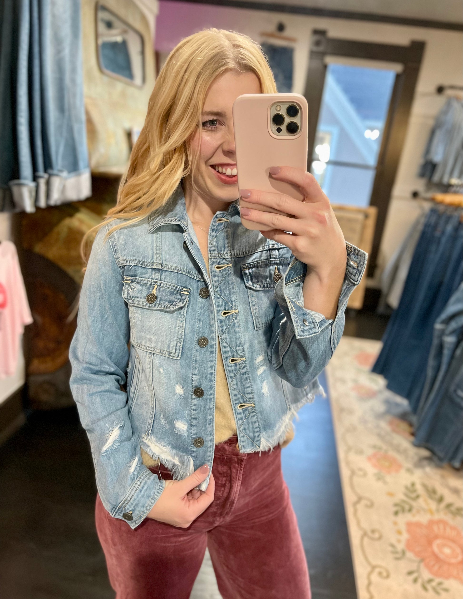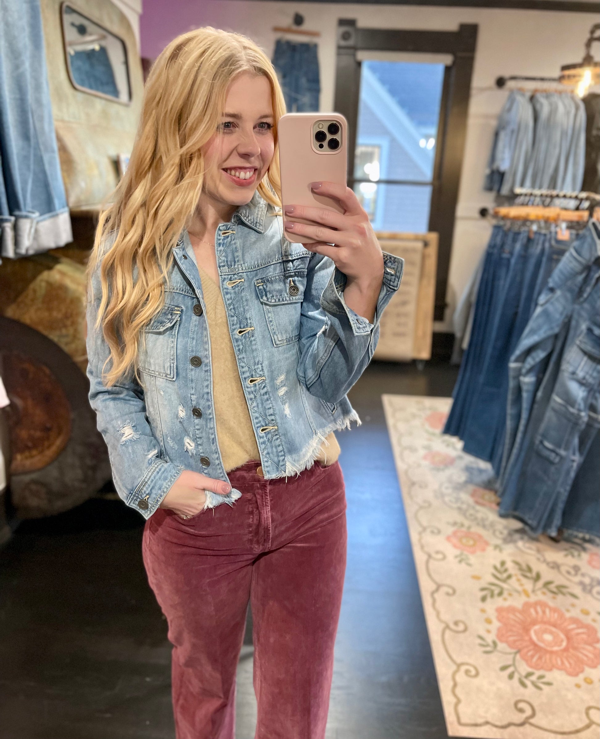 Our distressed denim jacket is our best-selling piece of clothing. We love the classic fitting, ultra soft jacket with distressing all throughout. This is the most packable jacket since you can fold it down so small! Will last you years.