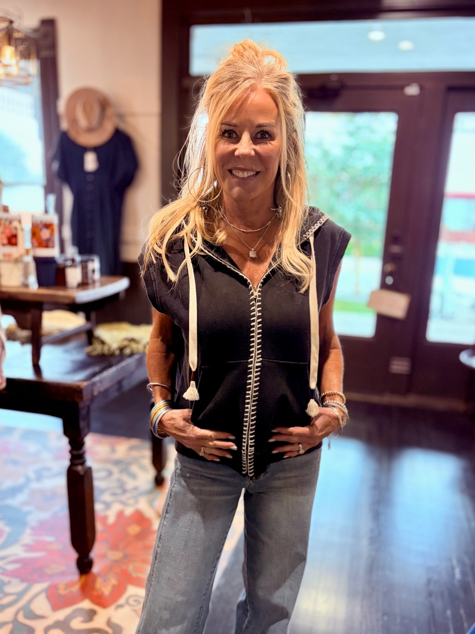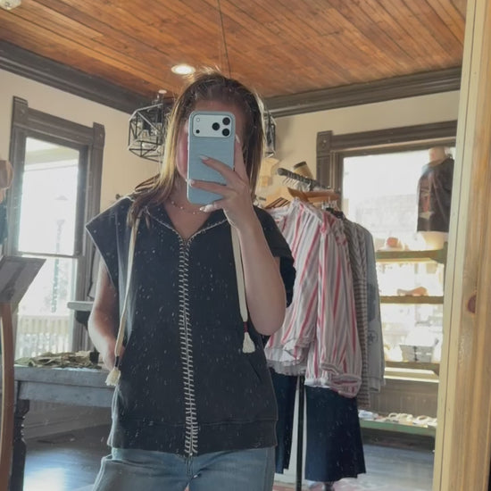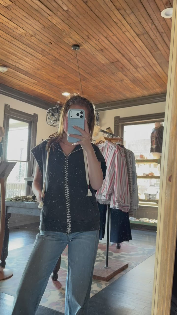 A casual layer with crafted edge, this sleeveless zip-up hoodie is cut from soft cotton fleece with bold contrast stitching. Designed with roomy armholes, a kangaroo pocket, and relaxed fit, it’s perfect for layering over tees or under outerwear.