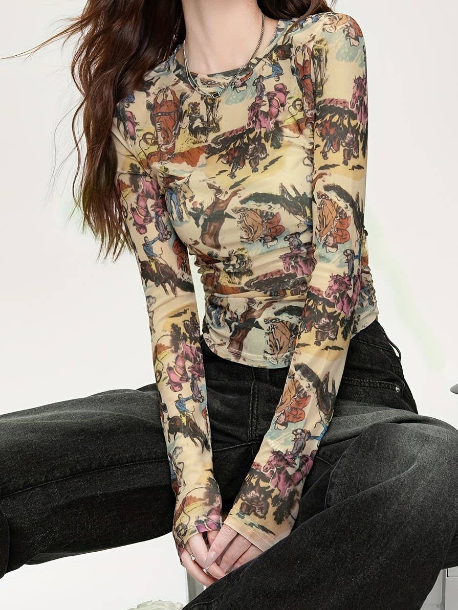 Wild Western Cowboy Rodeo print sheer mesh fitted top_RCJY05608