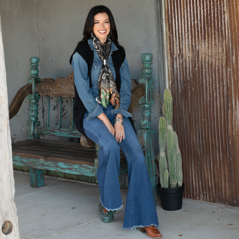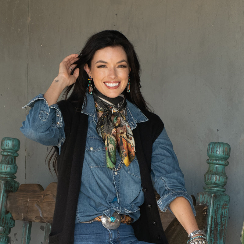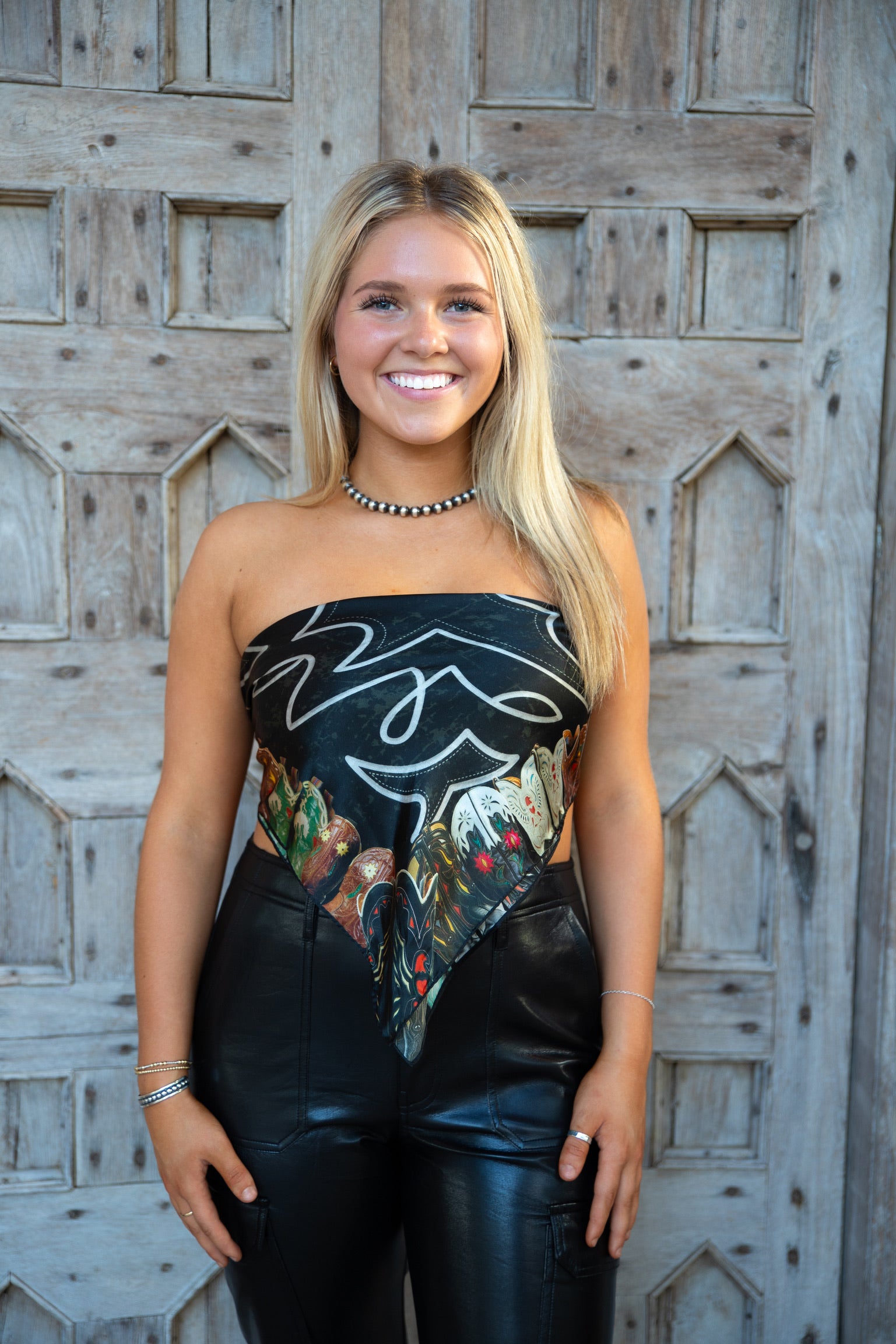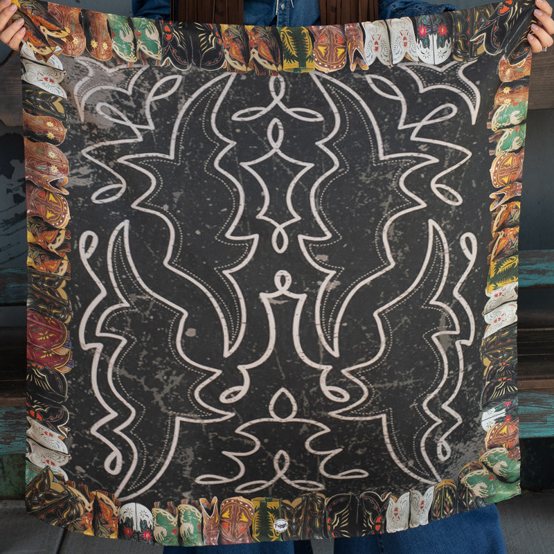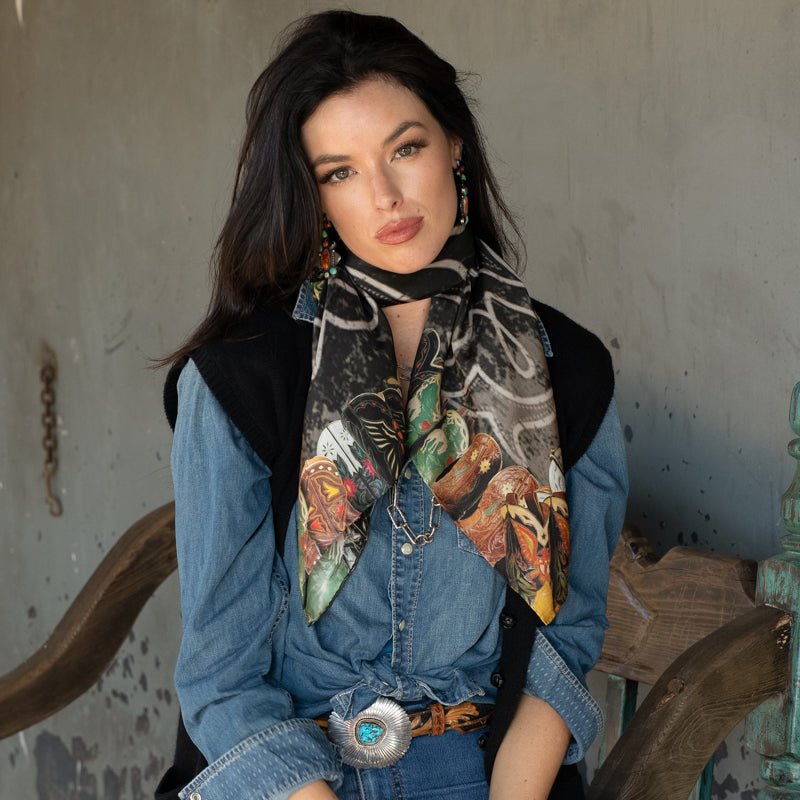 The Tops is 100% Satin Silk. Boot stitching in the center with an array of vintage boot tops at the edge. This great black scarf is a great way to top off any outfit.