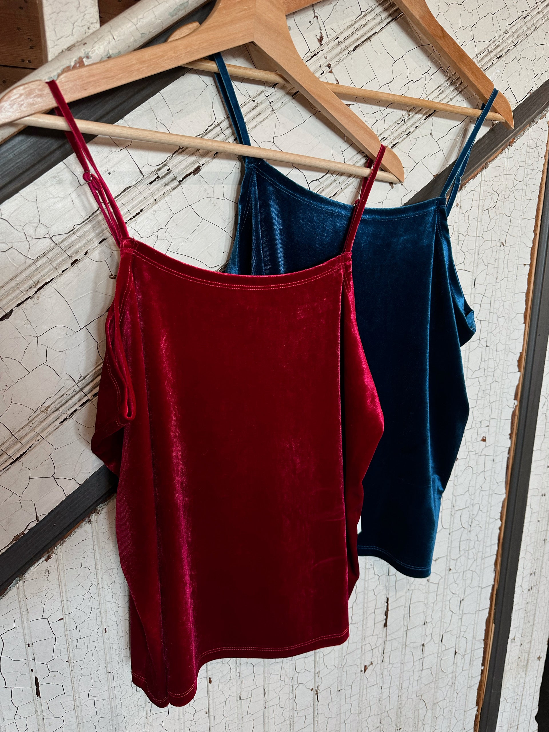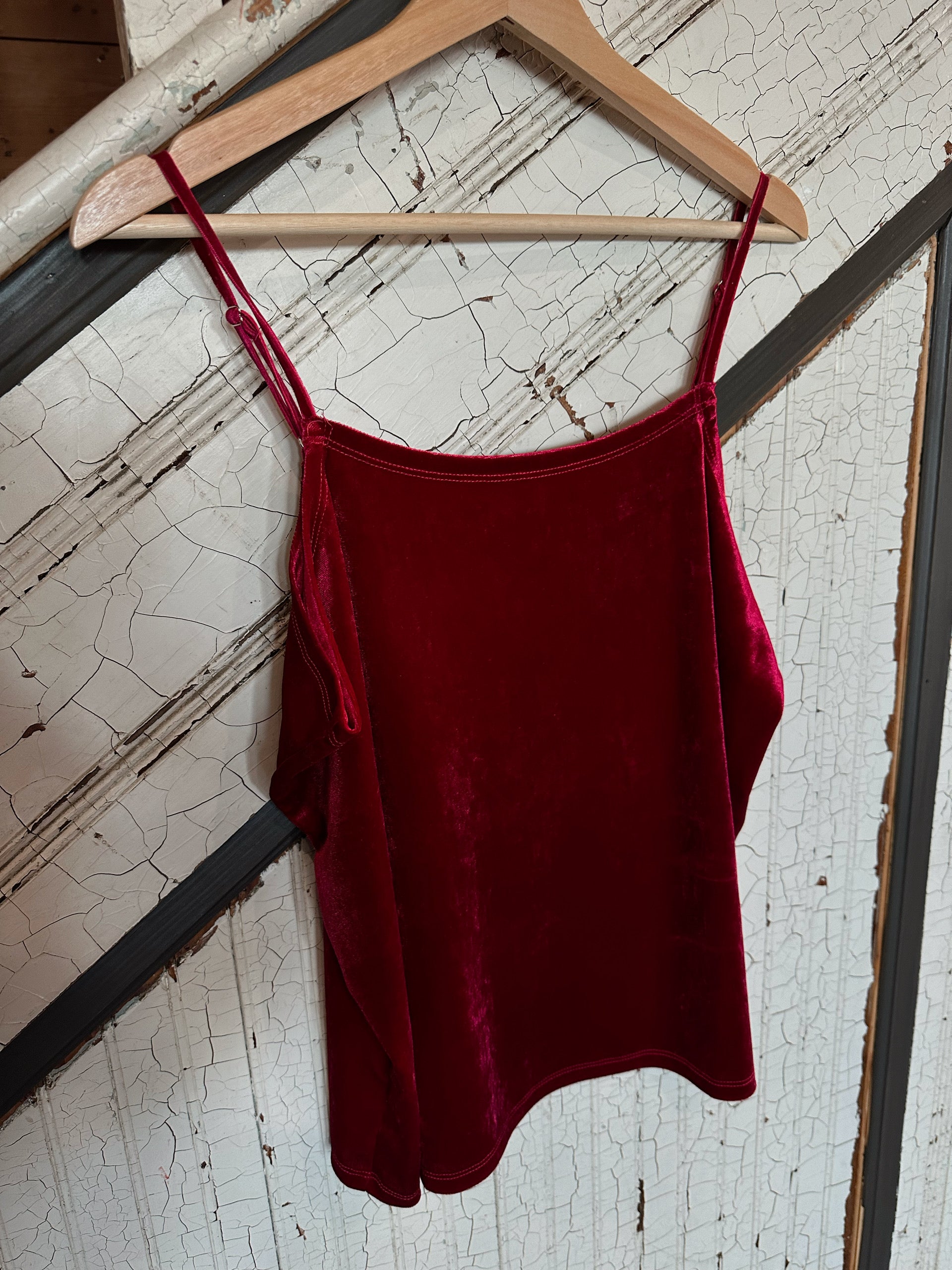 In a beautiful velvet, this spaghetti strap tank top is available in 2 colors and layers beautifully in winter. True to size.